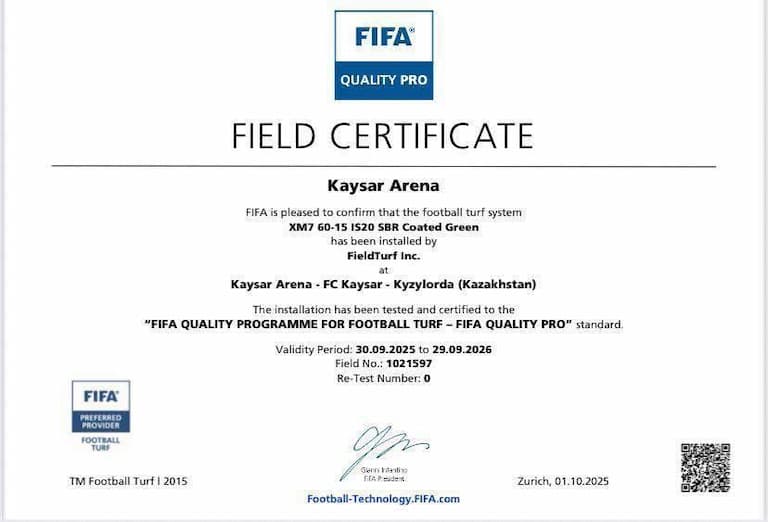 Қызылордадағы жаңа стадион алаңы QUALITY PRO сертификатына ие болды