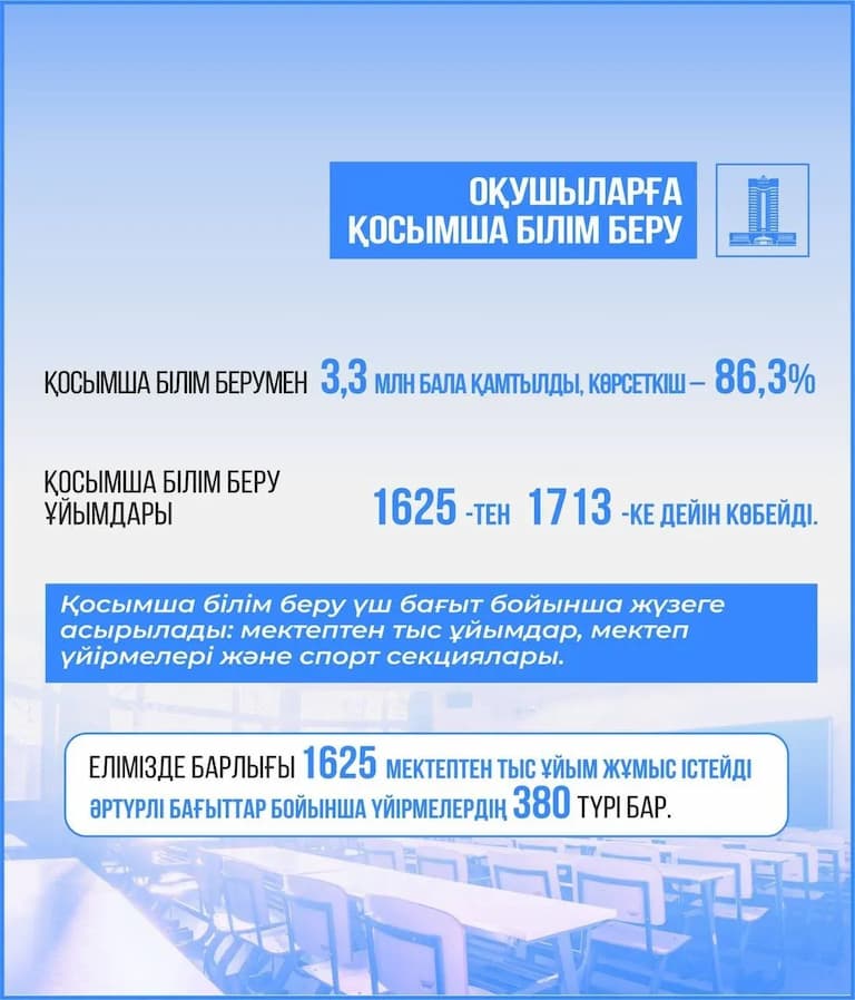 Мектепке дейінгі ұйымдарда мектепке дейінгі ұйымдарға бармайтын балалардың ата-аналары үшін 4,2 мыңнан астам консультациялық пункт жұмыс істейді. Бұл тармақ балаларды тәрбиелеу мен дамытуға маңызды көмек көрсетеді, оларды оқыту мен мектепке дайындаудың тең бастапқы жағдайларын қамтамасыз етеді. Ағымдағы жылы 328 мыңнан астам ата-ана мен балаға әдістемелік және педагогикалық қолдау көрсетілді.