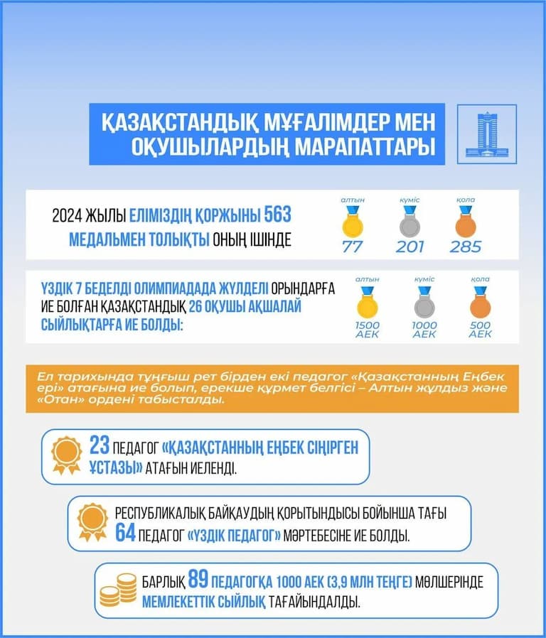 Ел тарихында тұңғыш рет бірден екі педагог «Қазақстанның Еңбек ері» атағына ие болып, ерекше құрмет белгісі – Алтын жұлдыз және «Отан» ордені табысталды. Бұл еліміздің педагогтарының еңбегіне Президент көрсеткен жоғары баға, құрмет пен сенім. Сонымен қатар Мемлекет басшысының қолынан 27 педагог «Қазақстанның еңбек сіңірген ұстазы» атағына ие болды. Республикалық байқаудың қорытындысы бойынша тағы 64 педагог «Үздік педагог» мәртебесіне ие болды. Барлық 93 педагогқа 3,9 млн теңге мөлшерінде мемлекеттік сыйлық тағайындалды.