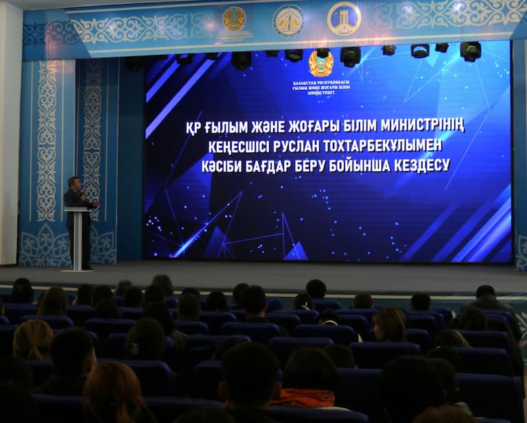 Кездесуге ҚР Ғылым және жоғары білім министрінің кеңесшісі Руслан Емелбаев және профориентолог, @eduser.online негізін қалаушы Айдос Жұманазаров қатысып, түсіндірме жұмыстарын жүргізді.