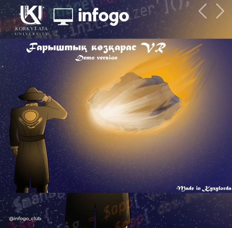 - «Іnfogo club» IT ұйымы жақында ашылды. Ұйымның мақсаты – IT саласына қызығушылығы бар жастарды бір алаңға жинау. Жай ғана оқыту емес, теориямен қатар практиканы қолданып, қоғамға маңызы бар жаңа жобаларды іске асыру. Алғашқы жобаларымыздың бірі виртуалды шындық әлеміне бағытталды. Жоба қолдануға дайын. Қызылорда қаласының тұрғындарына жобаны таныстырып, сынақ кезеңін өткіздік. Нәтижесі өте жақсы. Тұрғындарға ұнады. Қызығушылық танытып, қолдау білдіргендерге алғыс білдіреміз, -деді Қорқыт ата атындағы Қызылорда университетінің студенті, «Іnfogo club» IT ұйымының төрағасы Ғұбайдулла Орынбеков.
