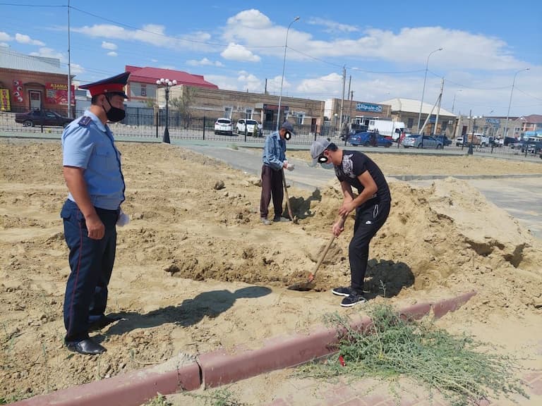 Қазіргі уақытта бұл азамат жергілікті әкімдік белгілеген жерде, яғни аудан орталығындағы орталық алаңда күніне 4 сағат құрылыс жұмыстарын атқару арқылы жазасын өтеуде.