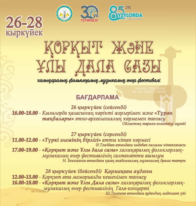 Kyzylorda-news.kz. Сыр өңірінде осы жылдың 26-28 қыркүйек күндері түркі тілдес елдердің халықаралық «Қорқыт және Ұлы дала сазы» фольклорлық-музыкалық өнер фестивалі басталады.