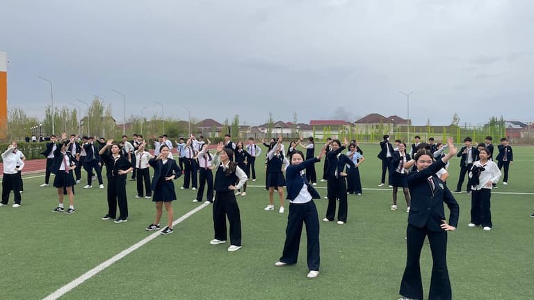 Күннің екінші бөлігінде оқушылар кезең-кезеңімен футбол алаңына жиналып, флешмоб арқылы салауатты өмір салтын насихаттады.
