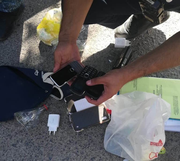 Ұсталған азаматтың бірін тексеру барысында бес дана ұялы телефон, үшдана қуаттағыш құрылғысы және екінші күдікті ер адамның сөмкесінен пластикалық бөтелкеге жасырылған тағы бес дана телефон, үш дана қуаттағыш пен екі дана құлаққап тәркіленіп алынды.