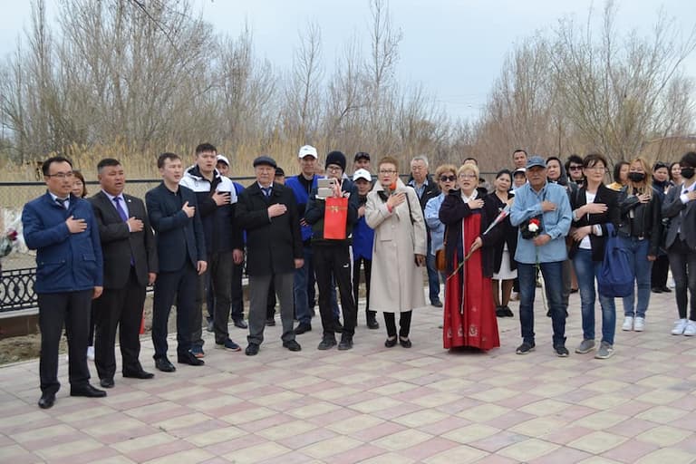 Жиналған жұртшылық корей батырларының ескерткішіне гүл шоқтарын қойды.