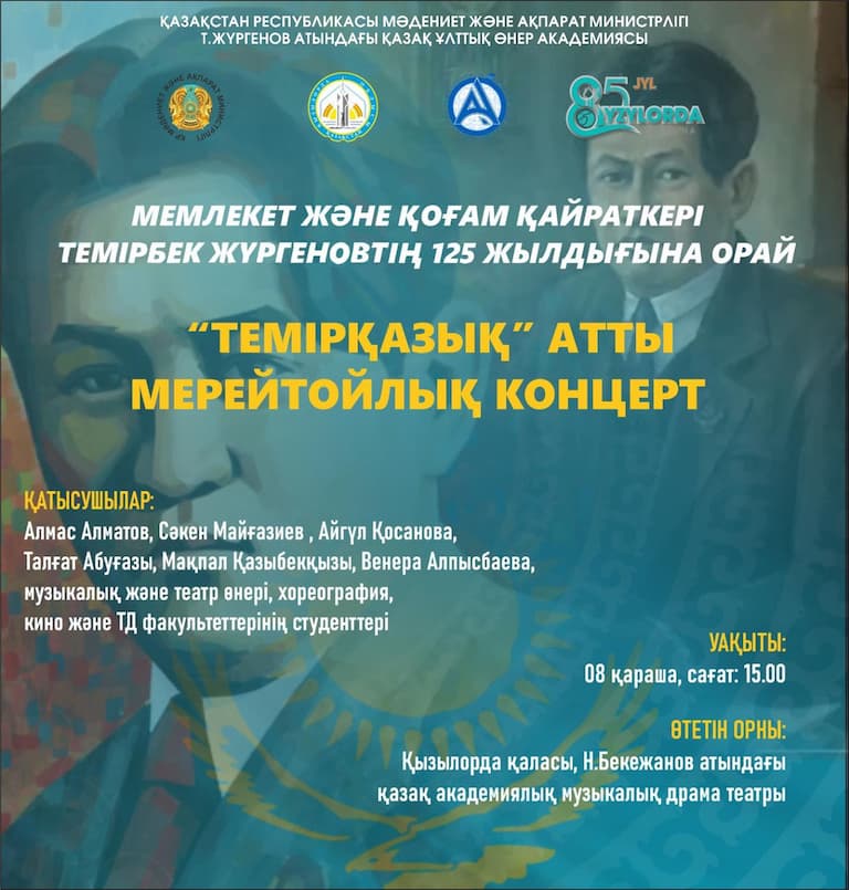 Халықаралық «ТҮРКСОЙ» ұйымы биылғы жылды «Темірбек Жүргенов жылы» деп жариялады. Осы орайда, есімі елге ғана емес, Орта Азия халықтарына ортақ бірегей тұлғаны ұлықтау мақсатында халықаралық, республикалық деңгейдегі әртүрлі іс-шаралар ұйымдастырылды. Ауқымды шаралар легі Қазақ ұлттық өнер академиясының «Темірқазық» атты мерейтойлық концертімен қорытындыланбақ. Аталмыш концертке өнер академиясының 68 өнерпазы қатысады. Барша Сыр халқын мерейтойлық концерттің куәгері болуға шақырамыз!, - деді басқарма басшысы Мира Жомартқызы.