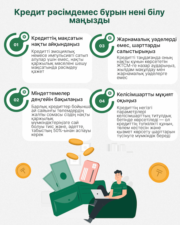 Сауатты түрде кредит алу – бұл қарыздан бас тарту емес, ақшаға саналы көзқарас. Жоспарлаңыз, есептеңіз, тексеріңіз және құжаттарды оқыңыз.