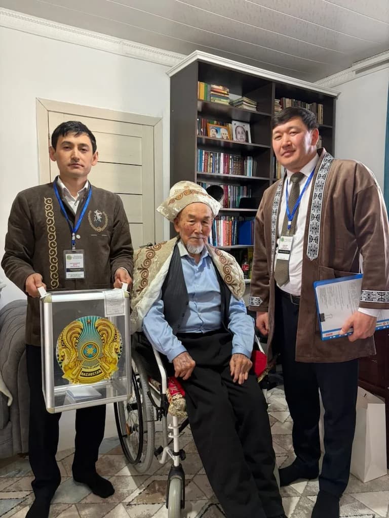 Үйде дауыс беру процесі де жалпы тәртіпке сәйкес жүргізілуде. Комиссия мүшелері бюллетеньдерді сайлаушыға табыстап, дауыс беру құпиялығы қатаң сақталуын қамтамасыз етуде.