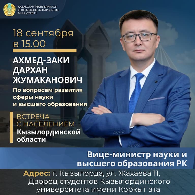 Kyzylorda-news.kz 18 сентября 2024 года в 15.00 часов состоится встреча вице-министра науки и высшего образования РК Дархана Жумахановича Ахмед-Заки с населением Кызылординской области по вопросам развития сферы науки и высшего образования.