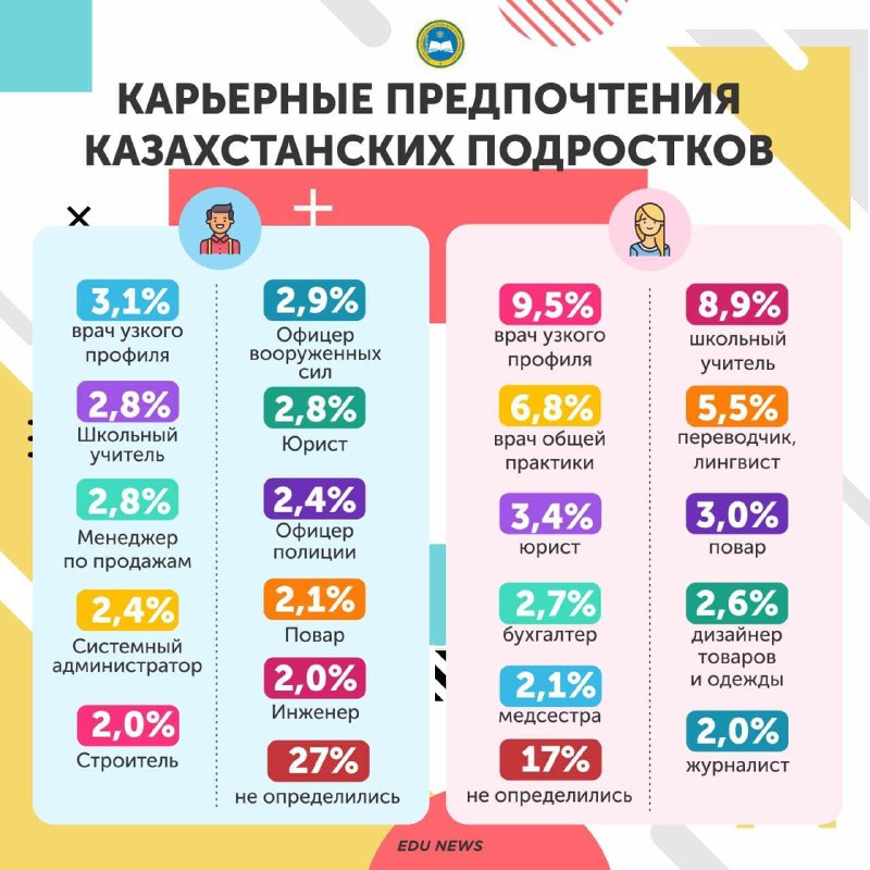 Тем не менее, по данным ведомства, каждый пятый казахстанский подросток, приближающийся к завершению обязательного образования, еще не определился с будущей профессией. При этом среди тех, кто не определился с выбором, оказалось больше мальчиков (27%), чем девочек (17%).