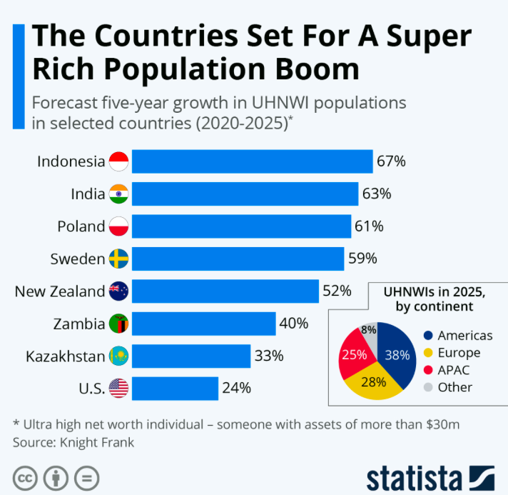 “Ожидается, что Америка будет большинством UHNWI в мире: 38 процентов – или 254 000 человек к 2025 году, в основном сконцентрированные в Соединенных Штатах. Но сильный рост в Азии приведет к тому, что в ближайшие 5 лет Азиатско-Тихоокеанский регион наверстает упущенное. Самыми быстрорастущими странами в мире будут Индонезия и Индия, которые увеличат размер своего населения более чем на 67 и 63 процентов соответственно”, – говорится в сообщении.