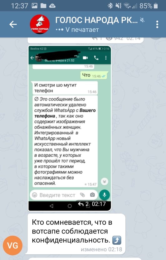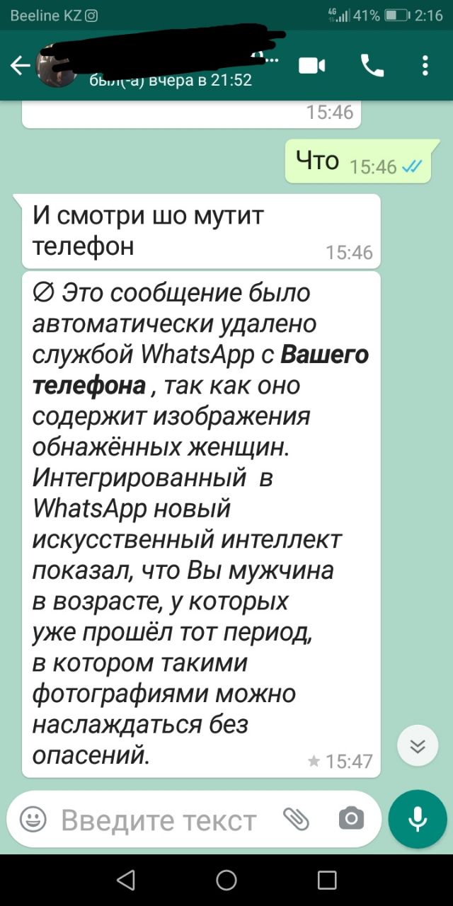 Kyzylorda-news.kz. Шуточную рассылку якобы от команды WhatsApp обсуждают казахстанцы. В ней говорится, что некое сообщение с изображением обнаженных женщин было удалено, так как получатель “мужчина в возрасте” и просмотр таких картинок для него небезопасен. Некоторые восприняли шутку всерьез и решили, что популярный мессенджер тайно следит за пользователями, передает Stopfake.kz.