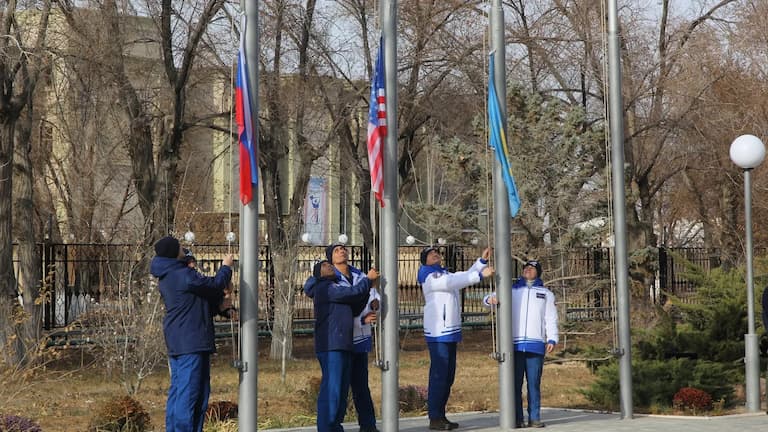 Космонавты Роскосмоса Сергей Кудь-Сверчков и Сергей Микаев подняли флаг Российской Федерации, астронавты NASA Кристофер Уилльямс и Анил Менон – флаг США, космонавты Роскосмоса Пётр Дубров и Анна Кикина – флаг Казахстана.