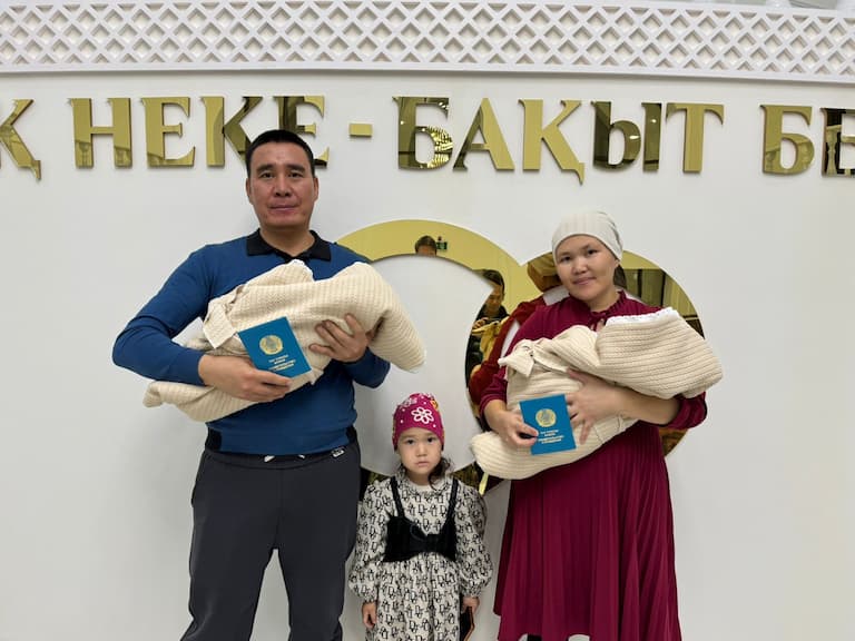 В семье Азамата и Айнур Баймаганбетовых большой праздник – на свет появились двойняшки Арай и Нурай. У них уже есть трое братьев и две сестры. По словам новоиспеченных родителей, появление двойни в их роду – генетическая предрасположенность.