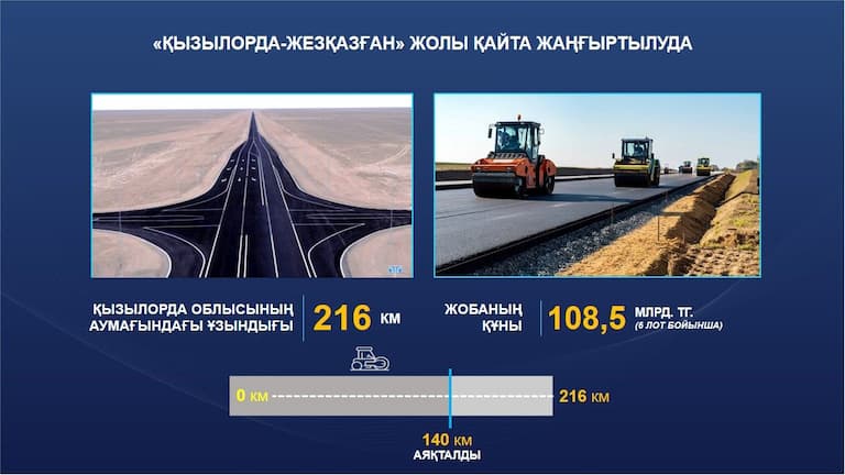 Напомним, что проект реконструкции автодороги «Кызылорда-Жезказган» общей протяженностью 426 км проходит через две области — Улытау и Кызылординскую. В области Улытау планируется реконструкция с переводом дороги с III технической категории на II категорию. В Кызылординской области продолжается реконструкция автодороги Кызылорда - Жезказган на участке с 12-го по 216-й км. В прошлом году было уложено более 80 км асфальтобетонного покрытия. На объектах задействованы асфальтобетонные заводы, мощностью более 1,3 тыс. тонн в час, а также более 800 рабочих и 400 единиц дорожной техники.
