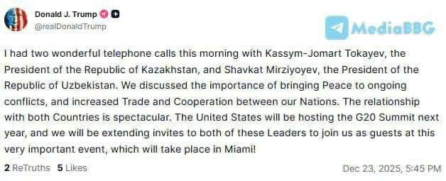 Kyzylorda-news.kz «Сегодня утром у меня был замечательный телефонный разговор с Касым-Жомартом Токаевым, президентом Республики Казахстан.