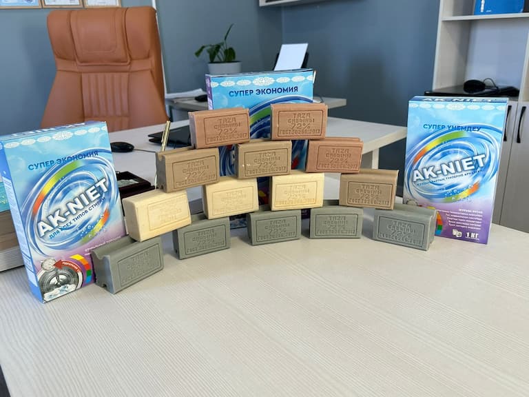− Ұнтақтың өзі кальциленген сода. Мысалы, қарапайым содаға қосымша заттар қосу арқылы жасалады. Біз де технологтармен ақылдасып, зерттеу жұмыстарын жүргіздік. Кейіннен құрамын нақтылап 8 химиялық зат таңдап алдық. Оның ішінде көпіретін, аллергия бермейтін, киімді жұмсартатын, тазартатын, тоздырмайтын, бактерияларды өлтіретін және кір жуатын машинаға зияны жоқ заттар бар. Өзіңіз де байқаған боларсыз, кейінгі уақытта аллергияға бейім адамдар көбейді. Сол үшін гипоаллергенді заттарды қосамыз. Ал ұнтақты «Ak-Niet» деп атадық. Қаладағы дүкендердің сөресінен таба аласыздар. Түркиядан келген мамандармен де бірге жұмыс атқардық. Біздің өнімдерді тексеріп, өздерінің өнімдерімен салыстырды. Технологтар тауардың құрамынан мін таба алмады. Олардың зауыттары күніне шамамен 5 тонна өнім шығарады.